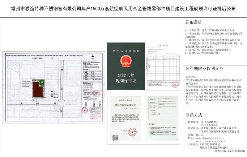 5月4日,常州市聯誼特種不銹鋼管有限公司年產1500萬套航空航天用合金管路零部件項目建設獲得工程規劃許可。該項目位于武進區,總建筑面積為13426平方米。