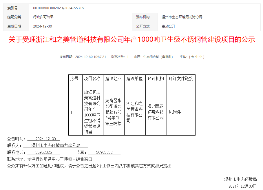 2024年12月30日溫州市生態(tài)環(huán)境局龍灣分局受理浙江和之美管道科技有限公司年產(chǎn)1000噸衛(wèi)生級(jí)不銹鋼管建設(shè)項(xiàng)目環(huán)境影響評(píng)價(jià)報(bào)告表并對(duì)外進(jìn)行公示,公示期:7個(gè)工作日。