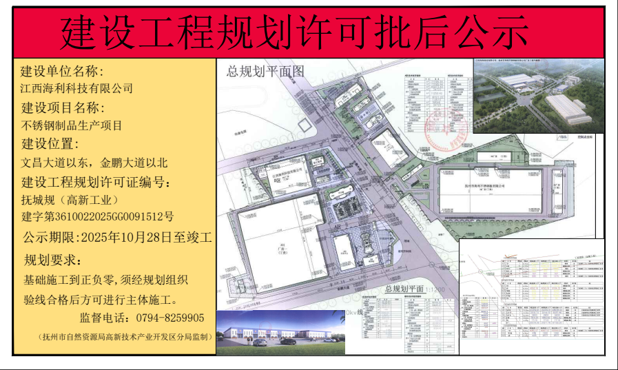 10月29日,江西海利科技有限公司不銹鋼制品生產(chǎn)項目(B02倉庫)建設(shè)工程規(guī)劃獲得許可批后公示。公示期限將至項目竣工。