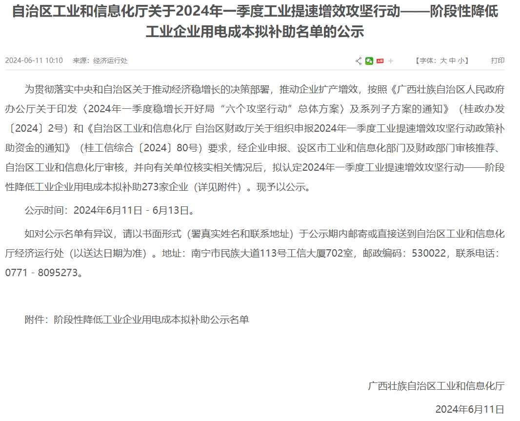 2024年6月11日,廣西壯族自治區(qū)工業(yè)和信息化廳就一季度階段性降低工業(yè)企業(yè)用電成本擬補(bǔ)助名單對(duì)外進(jìn)行公示,公示時(shí)間:2024年6月11日-6月13日。