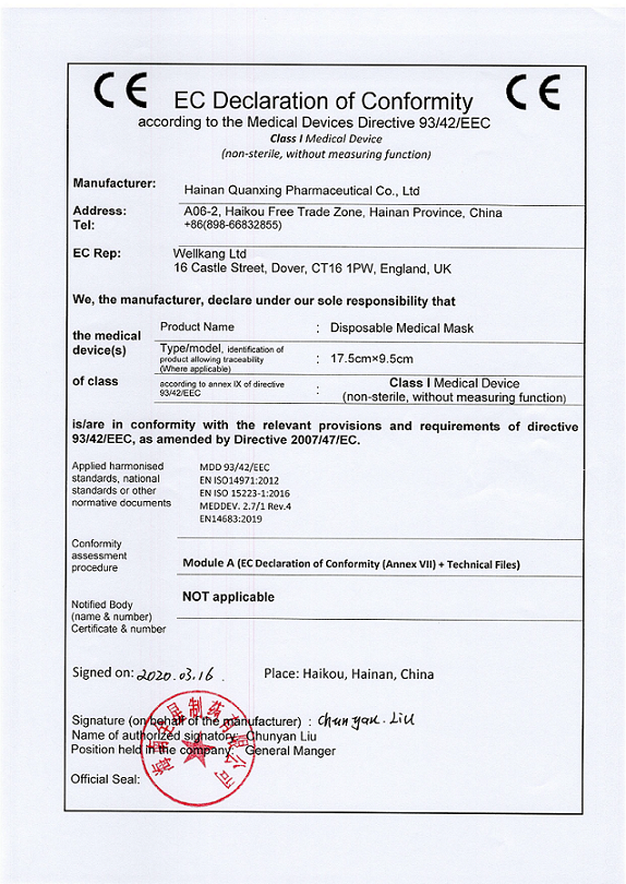 與此同步,正式啟動醫(yī)用口罩(非無菌)的CE認證工作,質(zhì)量部門牽頭認真研讀、解析歐盟醫(yī)用口罩的相關(guān)法規(guī)和注冊要求,多部門齊心協(xié)力、分工合作,按ISO13485醫(yī)療器械質(zhì)量管理體系標準完善我司醫(yī)療器械管理體系;委托第三方機構(gòu)按照歐盟醫(yī)用口罩標準EN14683-2019檢驗;根據(jù)歐盟醫(yī)療器械93/42/EEC指令進行注冊準備工作和自我符合性聲明。